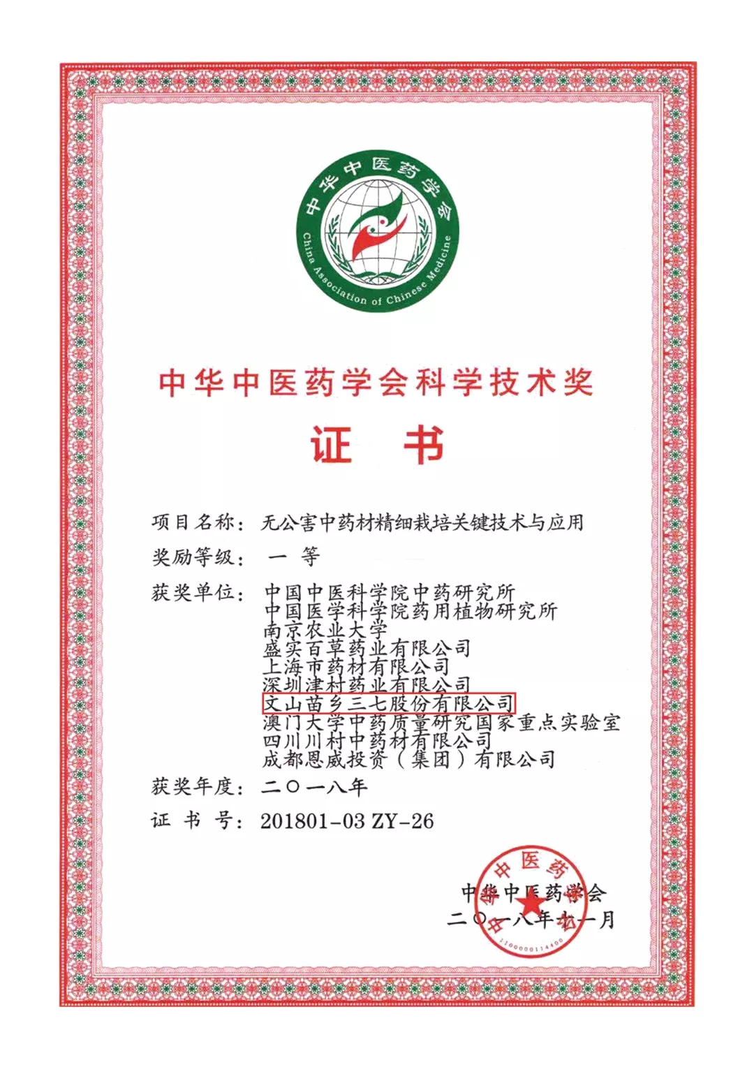 苗鄉(xiāng)三七榮獲中華中醫(yī)藥學會科學技術(shù)一等獎