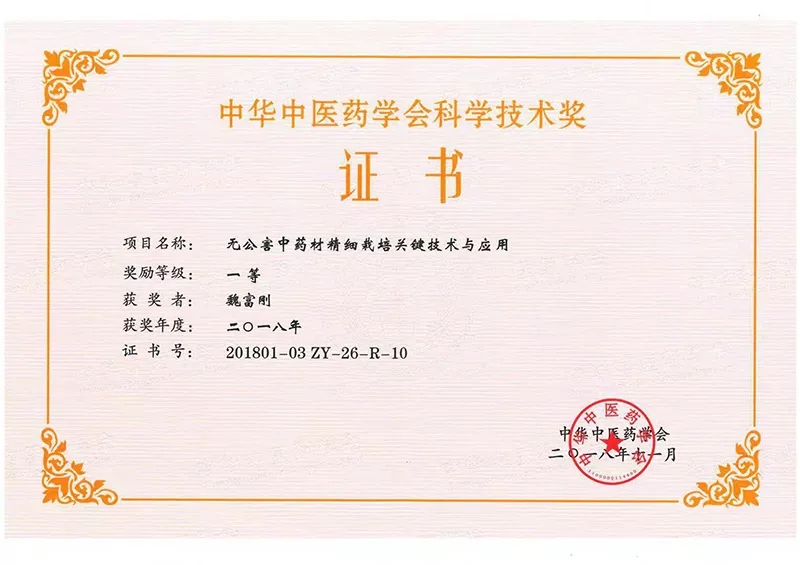 ? ? ? 2018年11月25日,苗鄉(xiāng)三七與中國中醫(yī)科學院中藥研究所等單位共同開展的“無公害中藥材精細栽培關(guān)鍵技術(shù)與應用”項目榮獲中華中醫(yī)藥學會科學技術(shù)一等獎,苗鄉(xiāng)三七科技公司總經(jīng)理魏富剛獲個人一等獎。