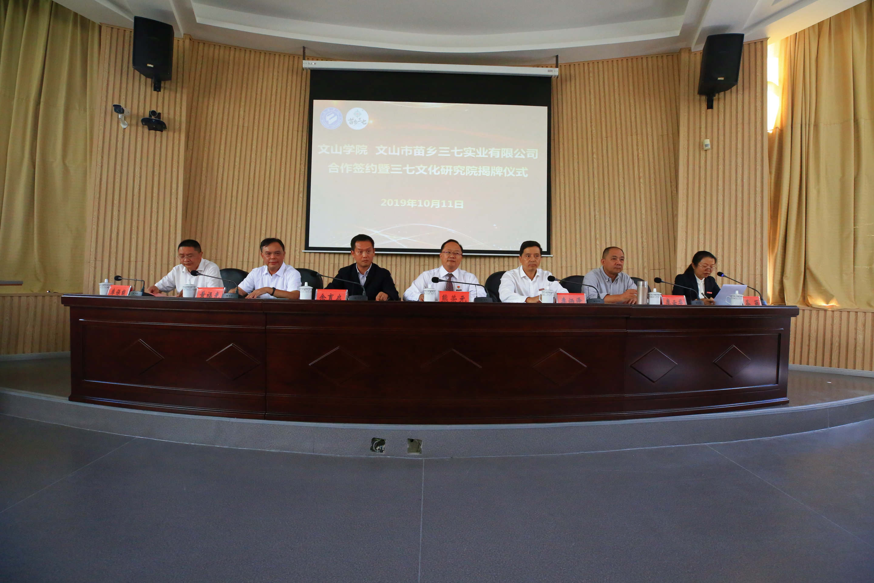 在文山學(xué)院學(xué)術(shù)交流中心報告廳,文山學(xué)院黨委書記熊榮元、文山學(xué)院院長李炳澤、文山州委宣傳部副部長廖云華、文山州教育體育局副局長黃福光、文山州三七和中醫(yī)藥產(chǎn)業(yè)發(fā)展中心主任李保能、苗鄉(xiāng)三七董事長余育啟等領(lǐng)導(dǎo)、文山學(xué)院師生代表、苗鄉(xiāng)三七員工代表等三百余人出席簽約揭牌儀式。