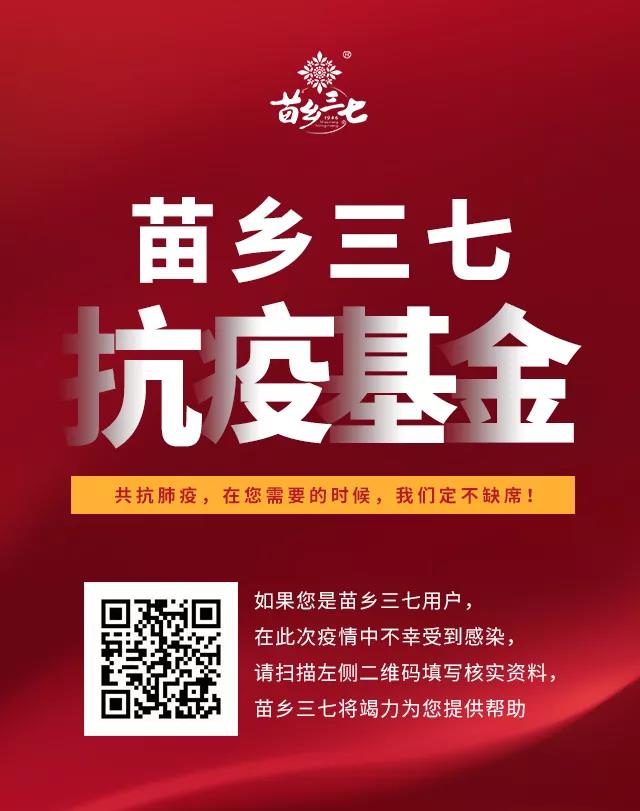 向防治疫情前線捐贈(zèng)價(jià)值87萬(wàn)元三七產(chǎn)品的同時(shí),苗鄉(xiāng)三七成立150萬(wàn)元抗疫基金,將為此次疫情中不幸感染的苗鄉(xiāng)三七用戶提供專項(xiàng)幫助!